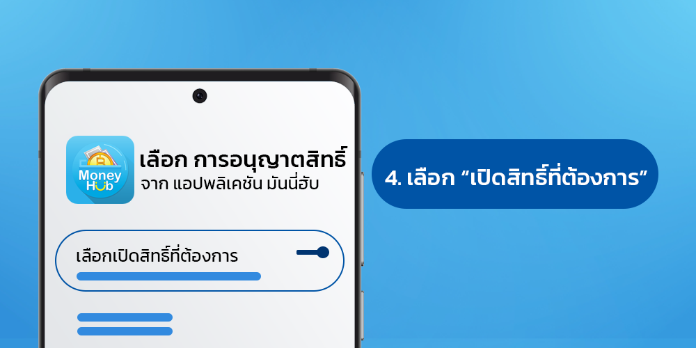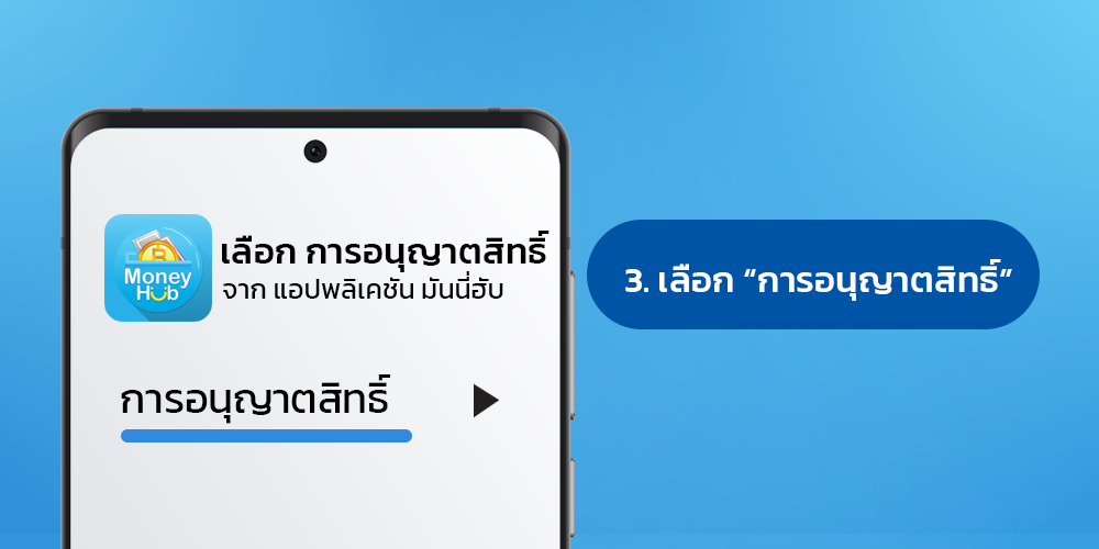 เมื่อคุณเลือกไปที่ "แอปพลิเคชัน มันนี่ฮับ" แล้ว ให้เลือกหาสิทธิ์ที่ต้องการให้อนุญาต จากนั้นเลื่อนปุ่มเพื่อเปิดอนุญาต (หรือปิด หากคุณต้องการยกเลิกการอนุญาต)