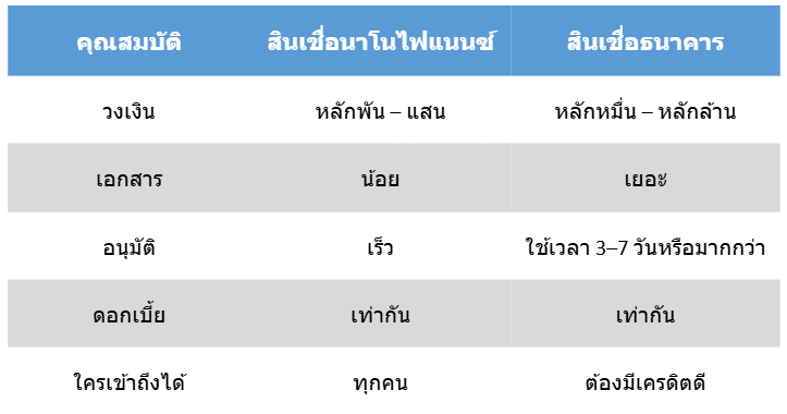 จากตารางจะเห็นว่า สินเชื่อนาโนไฟแนนซ์เหมาะกับคนที่ต้องการเงินด่วน ไม่ต้องการเอกสารเยอะ และพร้อมจ่ายดอกเบี้ยสูงกว่าเล็กน้อย